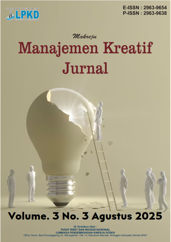 Manajemen Kreatif Jurnal (MAKREJU), yang telah memiliki Nomor E-ISSN : 2963-9654 dan P-ISSN : 2963-9638 diterbitkan oleh Pusat Riset dan Inovasi Nasional dan berfokus pada penerbitan artikel berkualitas tinggi yang didedikasikan untuk semua aspek penelitian, masalah, dan perkembangan terbaru di bidang Ilmu Manajemen. Topik dalam Manajemen Kreatif Jurnal (MAKREJU) berkaitan dengan aspek apapun dari manajemen, namun tidak terbatas pada topik berikut : Manajemen Sumberdaya Manusia , Manajemen Keuangan, Manajemen Pemasaran, Manajemen Sektor Publik, Manajemen Operasional, Manajemen Rantai Pasokan, Corporate Governance, Etika Bisnis, Akuntansi Manajemen dan Pasar Modal dan Investasi. Jurnal ini terbit 1 tahun 4 kali (Februari, Mei, Agustus dan November)